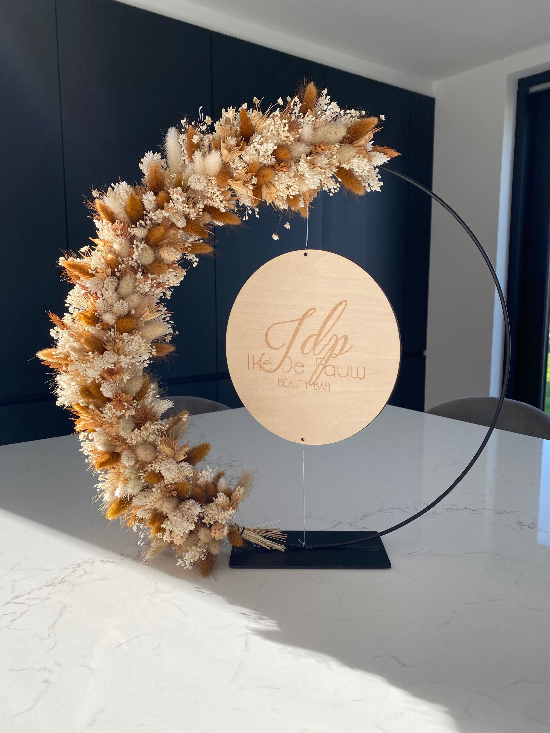 Metalen bloemenhoepel op voet met naam naar keuze/deze hoepel is heel vol versierd
