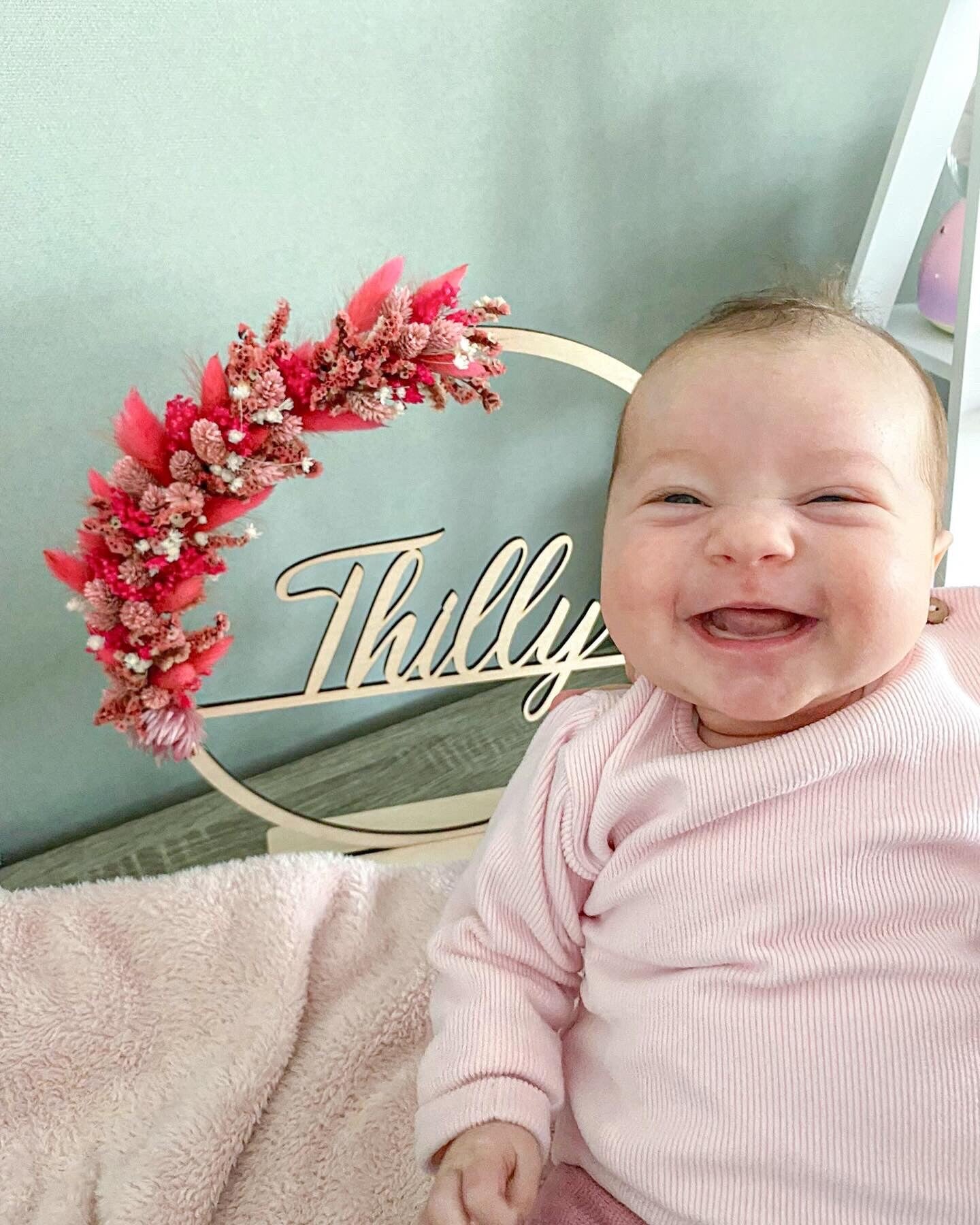 Bloemenhoepel met naam naar keuze. Het lettertype zoals op de foto